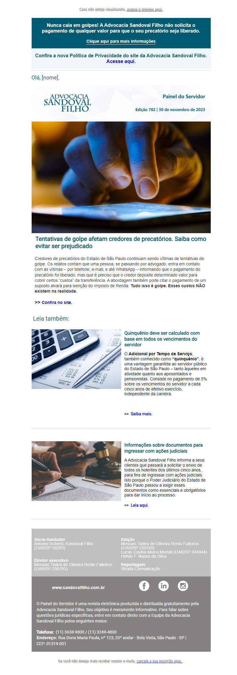 Nunca caia em golpes! A Advocacia Sandoval Filho não solicita o pagamento de qualquer valor para que o seu precatório seja liberado.