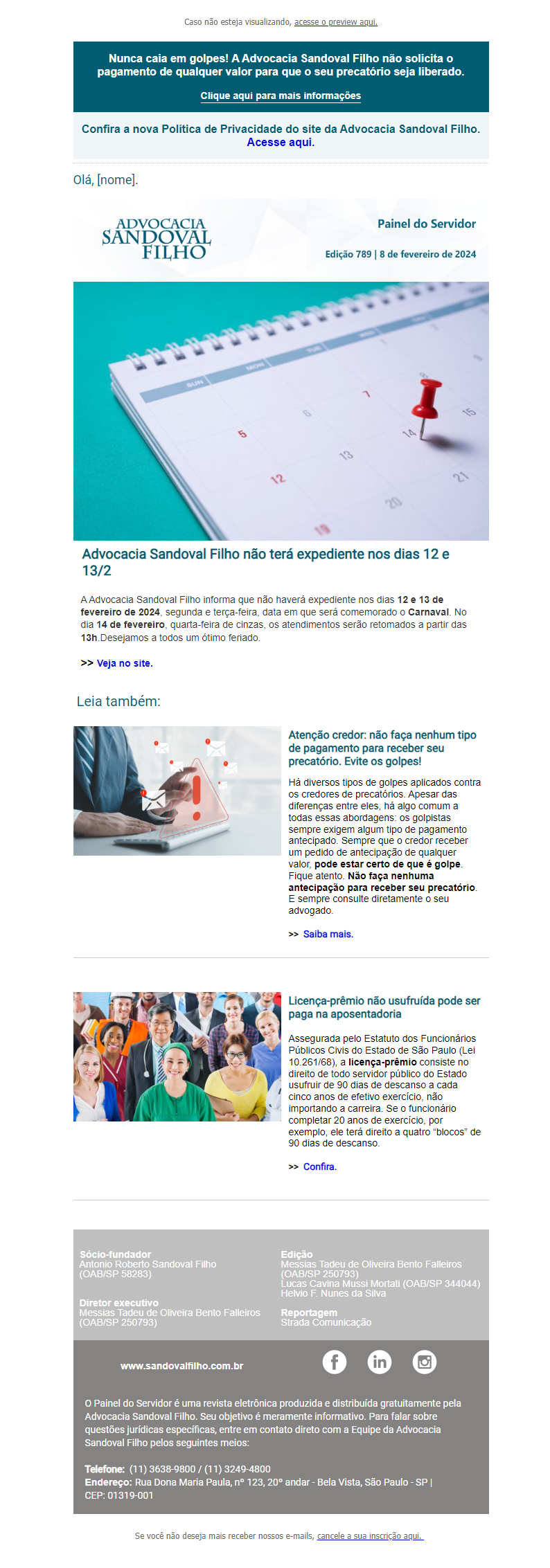 Nunca caia em golpes! A Advocacia Sandoval Filho não solicita o pagamento de qualquer valor para que o seu precatório seja liberado.