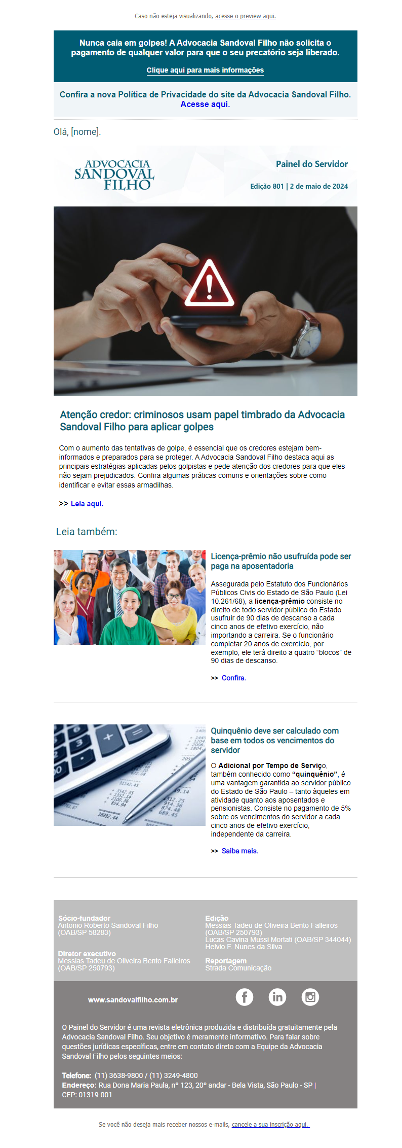 Nunca caia em golpes! A Advocacia Sandoval Filho não solicita o pagamento de qualquer valor para que o seu precatório seja liberado.