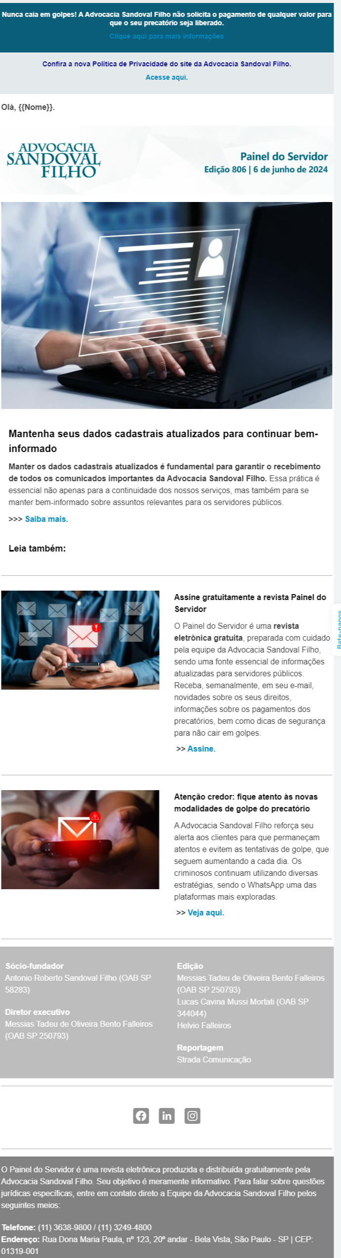 Nunca caia em golpes! A Advocacia Sandoval Filho não solicita o pagamento de qualquer valor para que o seu precatório seja liberado.