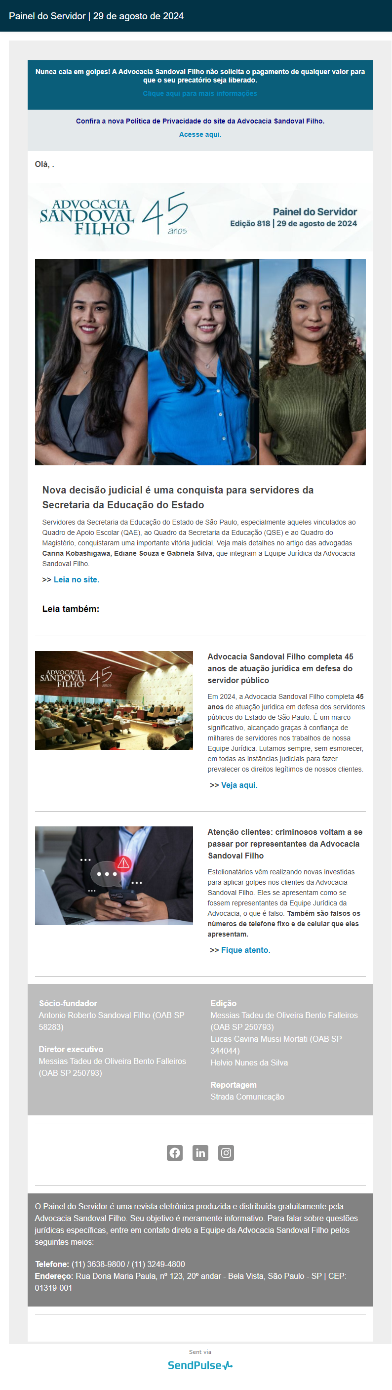 Nunca caia em golpes! A Advocacia Sandoval Filho não solicita o pagamento de qualquer valor para que o seu precatório seja liberado.