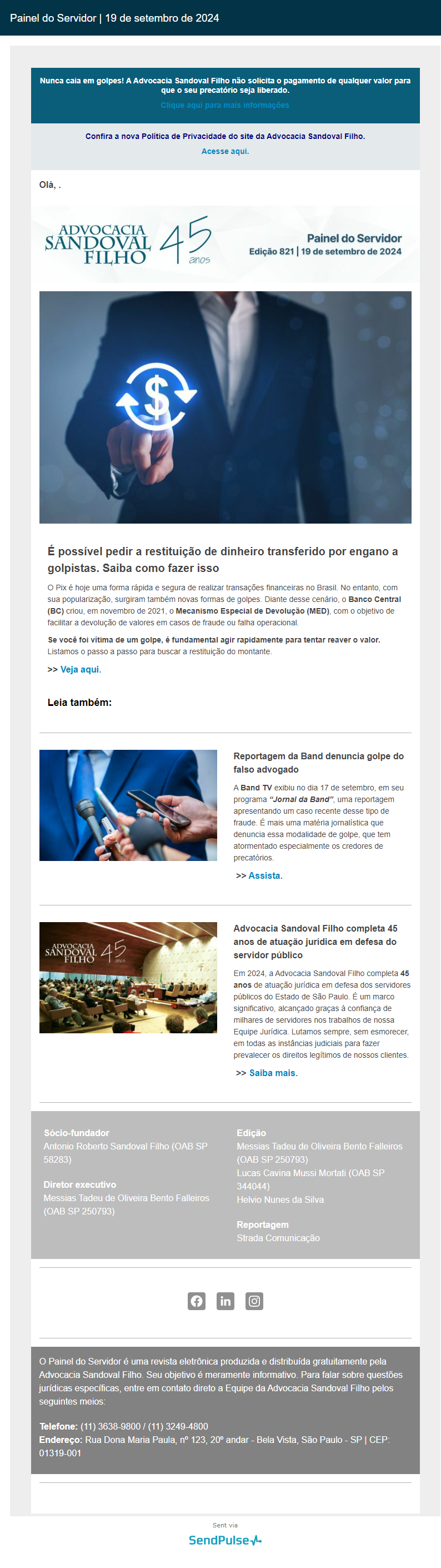 Nunca caia em golpes! A Advocacia Sandoval Filho não solicita o pagamento de qualquer valor para que o seu precatório seja liberado.