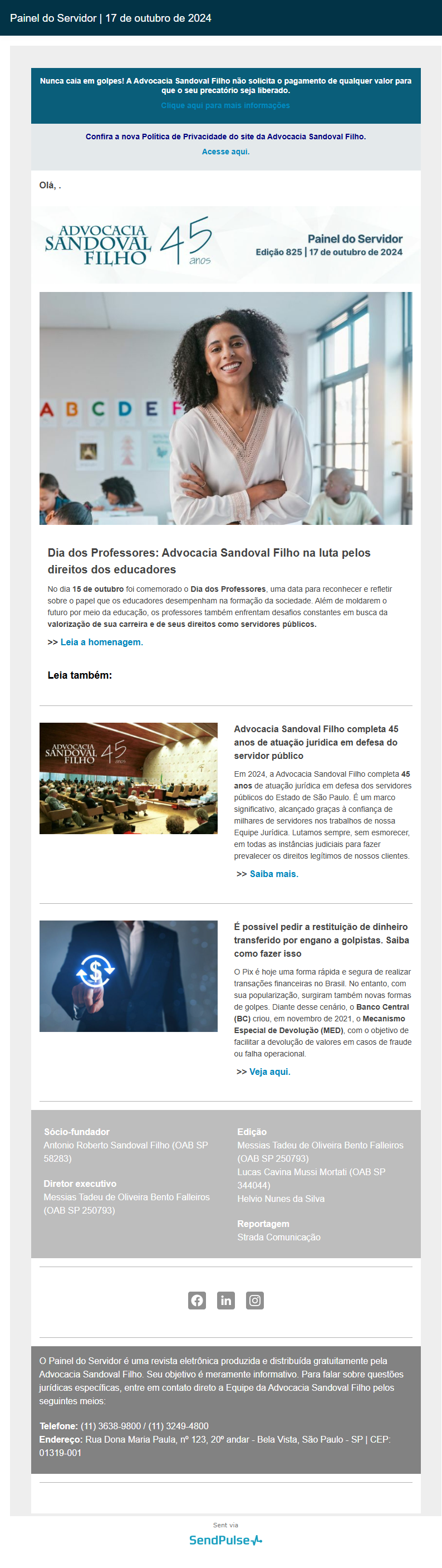 Nunca caia em golpes! A Advocacia Sandoval Filho não solicita o pagamento de qualquer valor para que o seu precatório seja liberado.