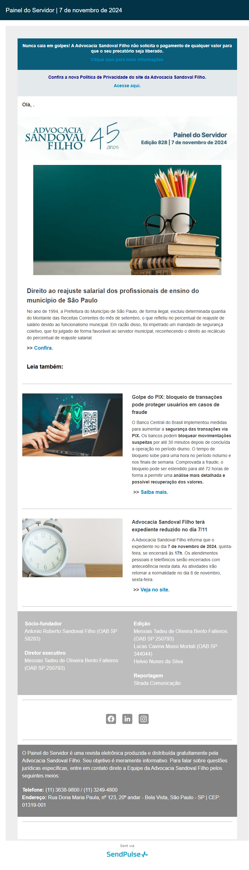 Nunca caia em golpes! A Advocacia Sandoval Filho não solicita o pagamento de qualquer valor para que o seu precatório seja liberado.