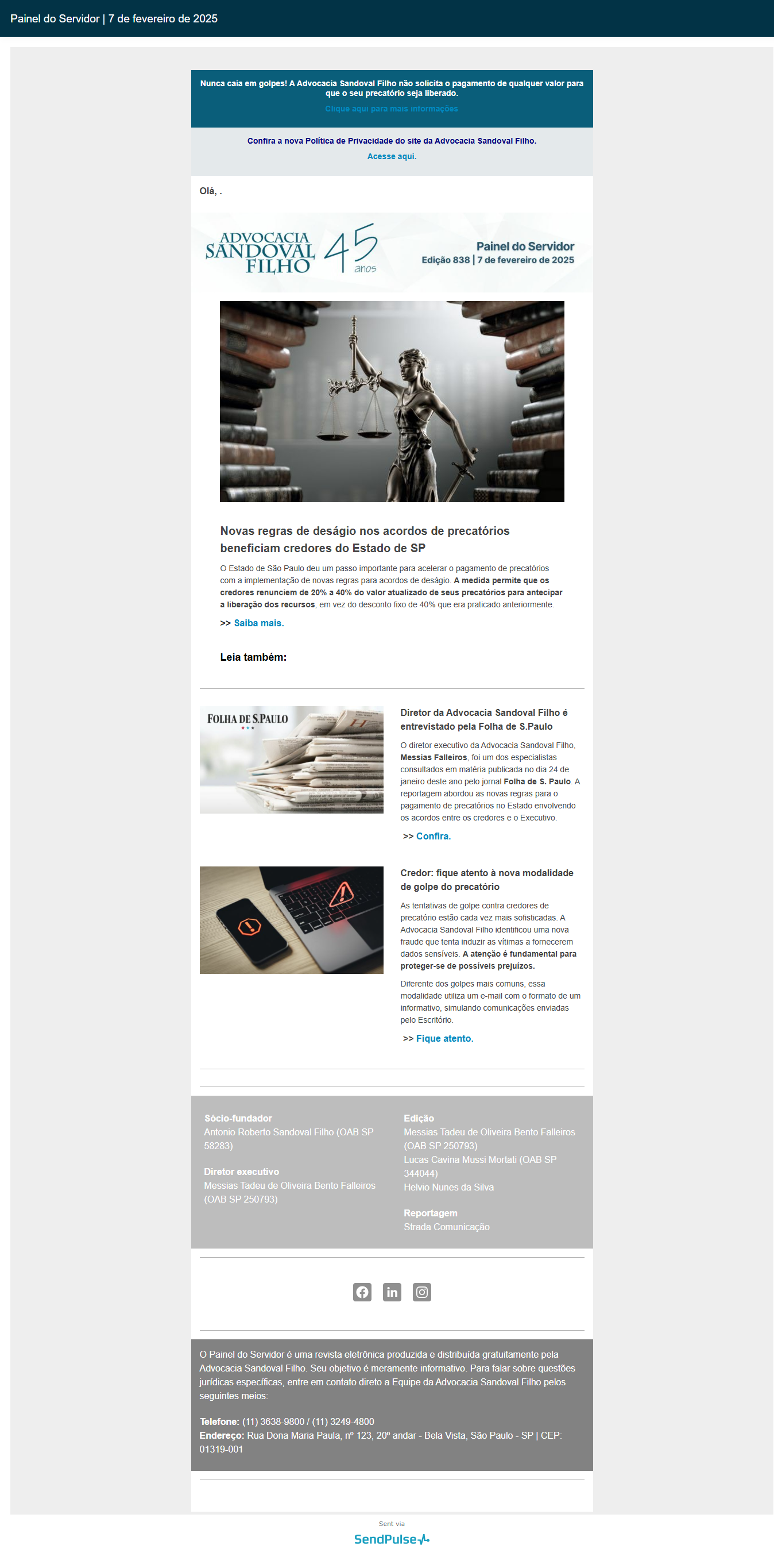 Nunca caia em golpes! A Advocacia Sandoval Filho não solicita o pagamento de qualquer valor para que o seu precatório seja liberado.