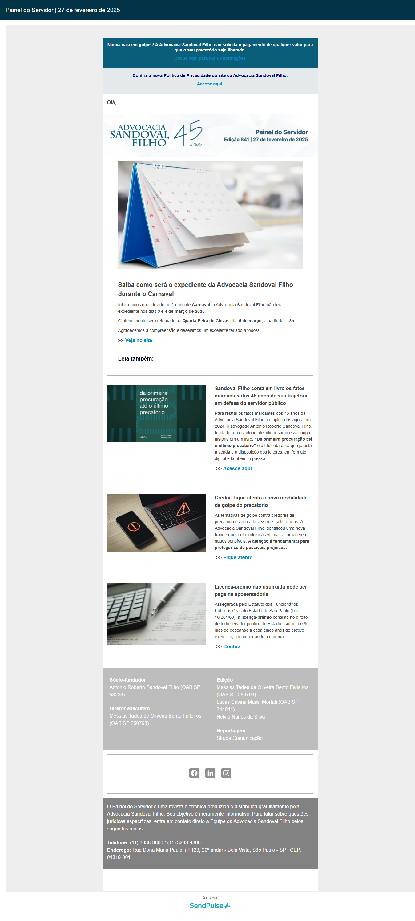 Confira a edição nº 841 do Painel do Servidor, enviada no dia 27 de fevereiro de 2025.