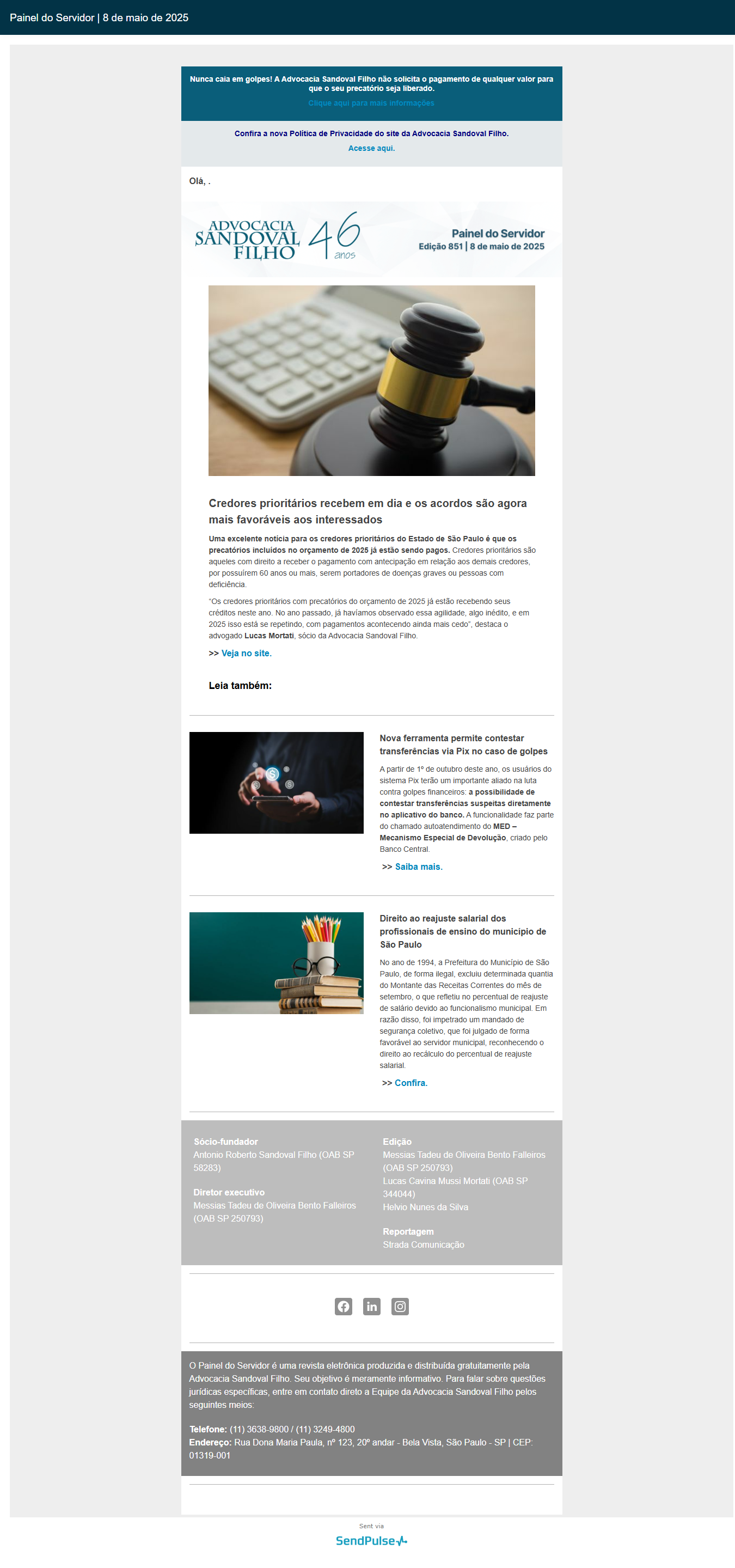 Nunca caia em golpes! A Advocacia Sandoval Filho não solicita o pagamento de qualquer valor para que o seu precatório seja liberado.