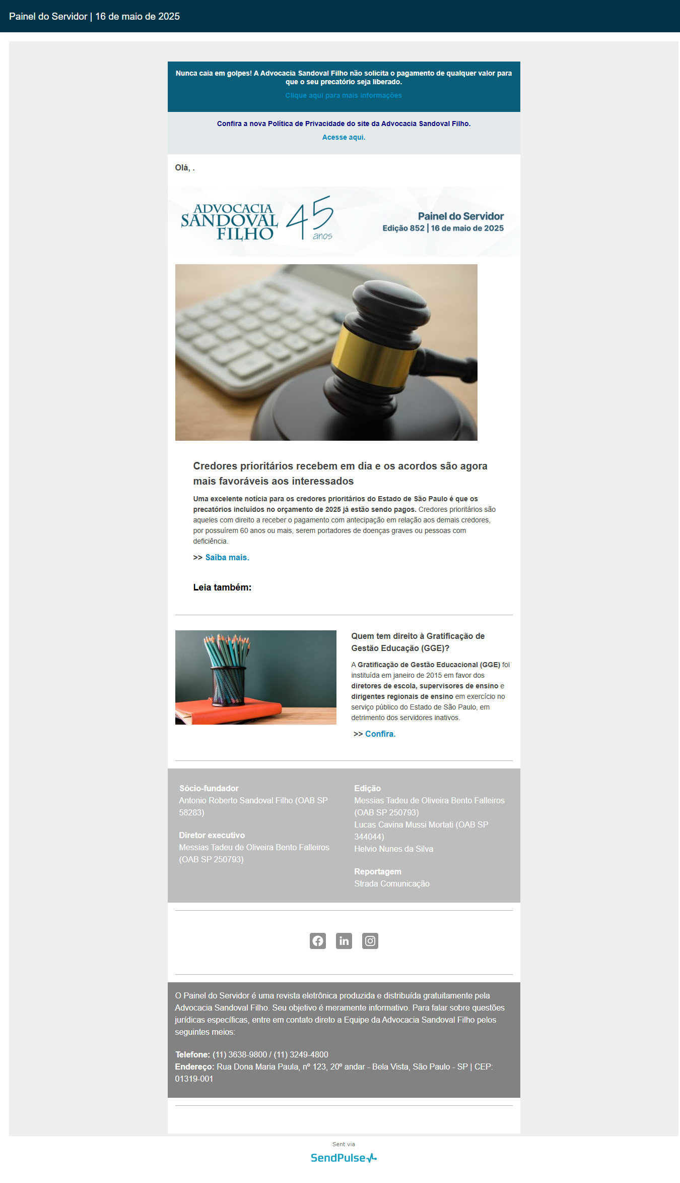 Confira a edição nº 852 do Painel do Servidor, enviada no dia 16 de maio de 2025.