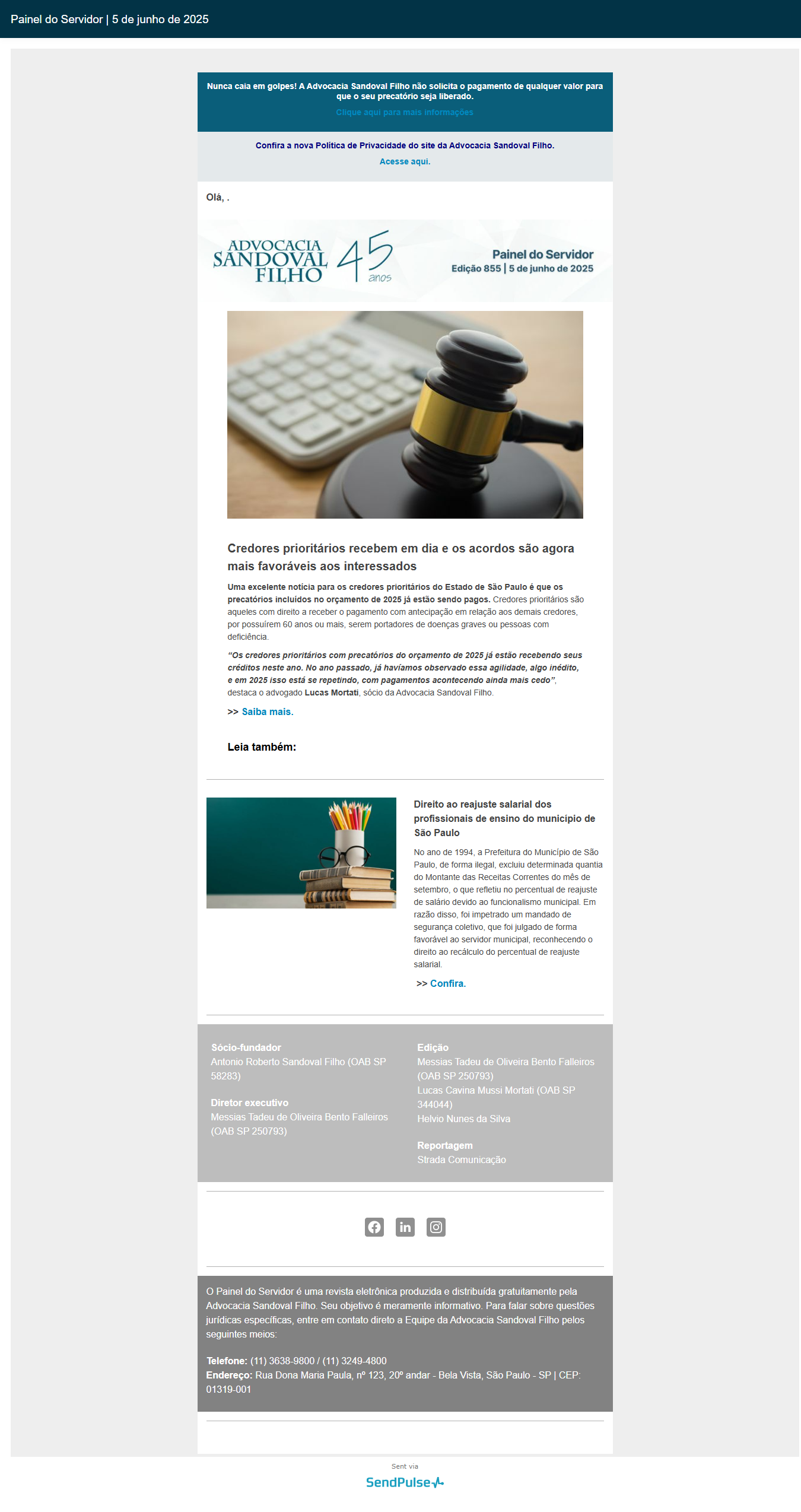 Nunca caia em golpes! A Advocacia Sandoval Filho não solicita o pagamento de qualquer valor para que o seu precatório seja liberado.