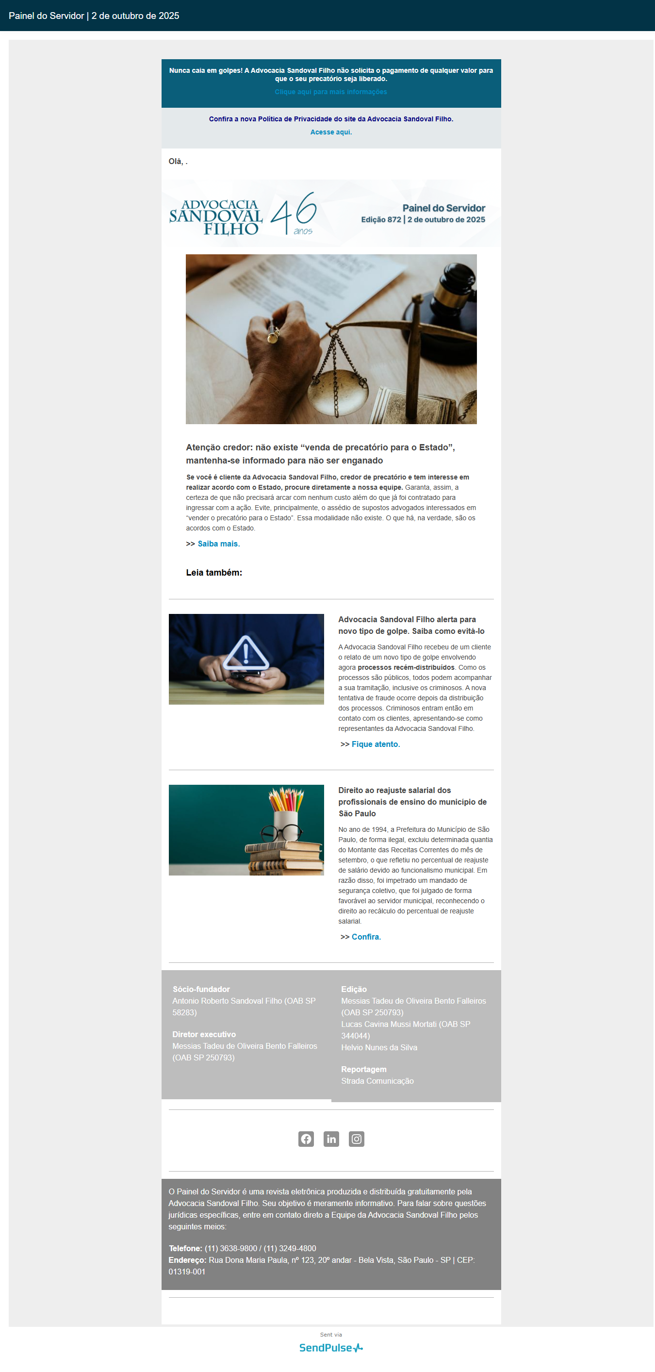 Nunca caia em golpes! A Advocacia Sandoval Filho não solicita o pagamento de qualquer valor para que o seu precatório seja liberado.