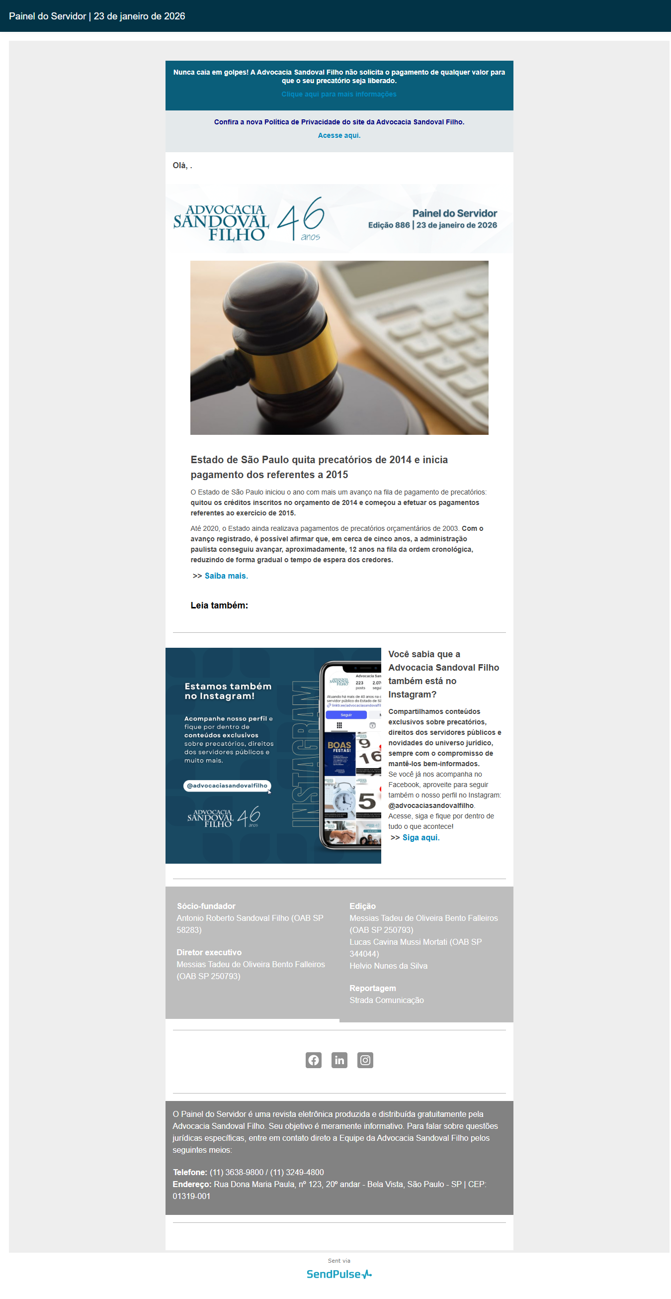 Confira a edição nº 886 do Painel do Servidor, enviada no dia 23 de janeiro de 2026.
