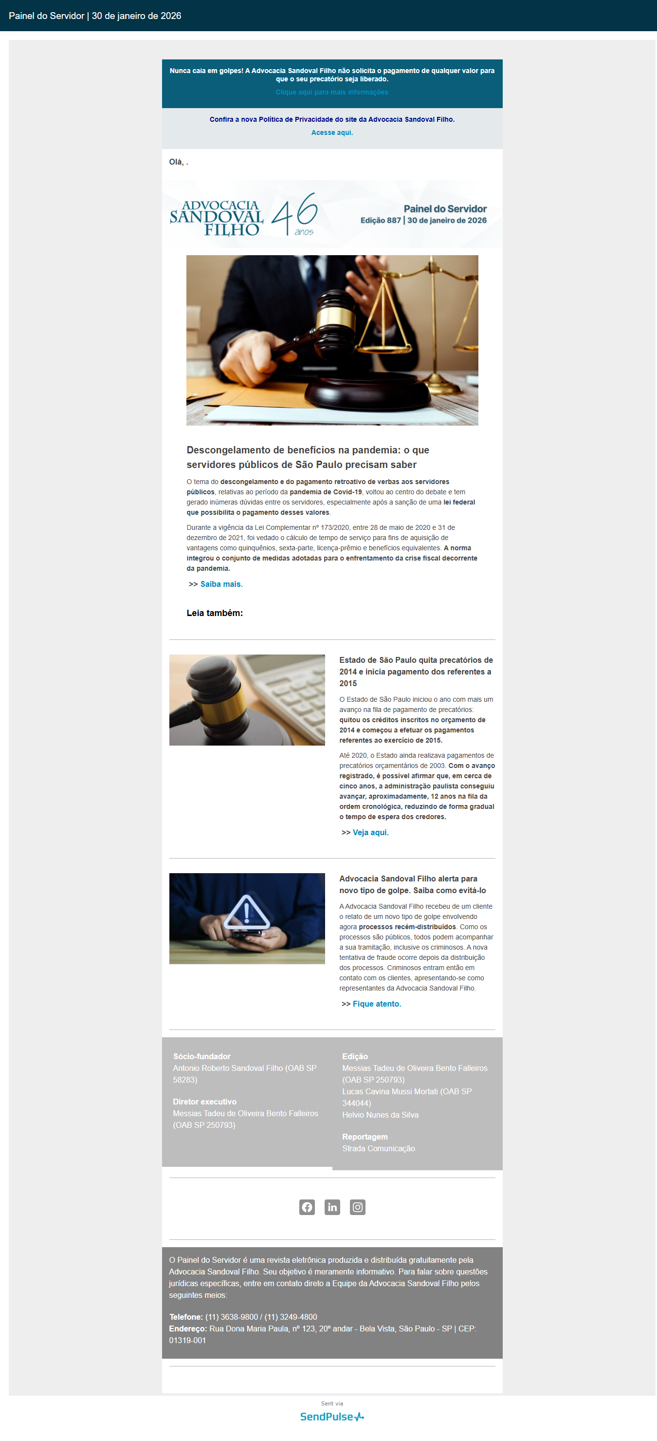 Nunca caia em golpes! A Advocacia Sandoval Filho não solicita o pagamento de qualquer valor para que o seu precatório seja liberado.