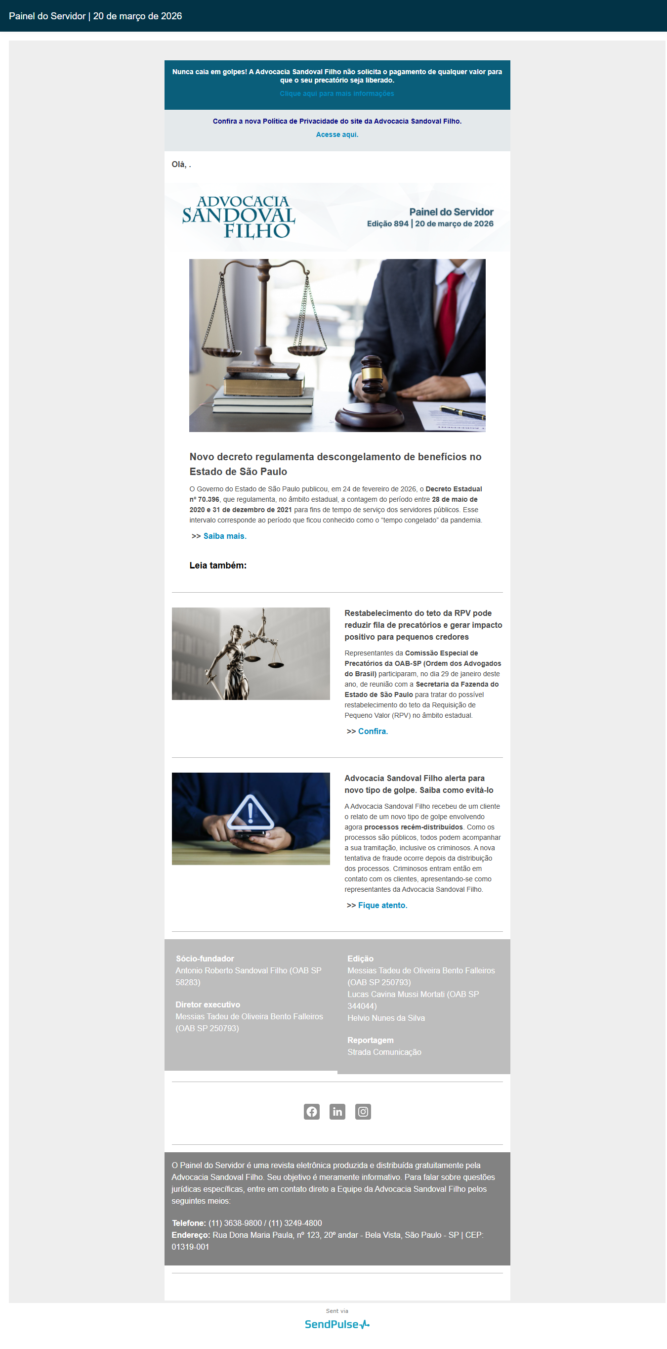 Nunca caia em golpes! A Advocacia Sandoval Filho não solicita o pagamento de qualquer valor para que o seu precatório seja liberado.