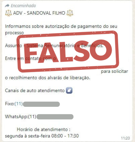 O pretexto dos golpistas é pedir que os clientes entrem em contato para solicitar o recolhimento de um suposto alvará de liberação. São falsos os números mencionados e todo o seu conteúdo da mensagem. Fique atento: a Advocacia Sandoval Filho não entra em contato com os clientes através do WhatsApp. Os contatos oficiais são realizados apenas através de e-mail, ligação ou correspondência.