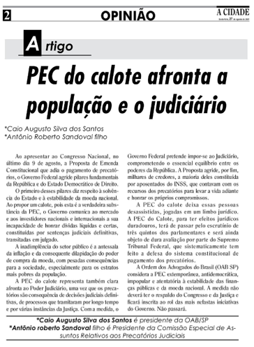 A Ordem dos Advogados do Brasil (OAB SP) considera a PEC extemporânea, antidemocrática, impopular e atentatória à estabilidade das finanças públicas e da moeda nacional. A medida não deverá ter o respaldo do Congresso e da Justiça e ficará inscrita no rol das mais nefastas iniciativas do Governo. Não passará.