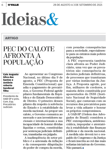 O governo Federal encaminhou ao Congresso Nacional, no início de agosto, Proposta de Emenda Constitucional (PEC) que propõe adiar o pagamento de precatórios devidos a milhares de pessoas, a maioria delas formada por aposentados do INSS. A PEC mereceu o repúdio da Ordem dos Advogados do Brasil (OAB SP). Em carta assinada pelo presidente da Ordem, Caio Augusto Silva dos Santos, e pelo presidente da Comissão de Precatórios, Antônio Roberto Sandoval Filho, a OAB SP considera a Proposta “extemporânea, antidemocrática e impopular”. A manifestação ganhou destaque na imprensa. Veja os detalhes.